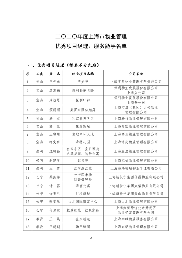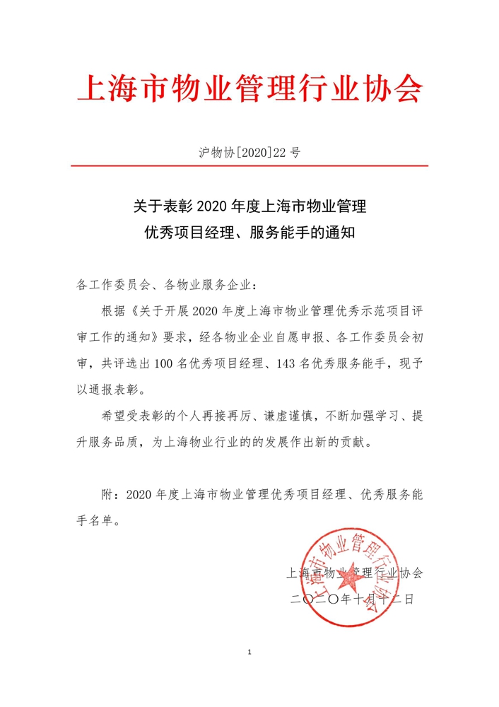 关于表彰2020年度上海市物业管理优秀项目经理、服务能手的通知